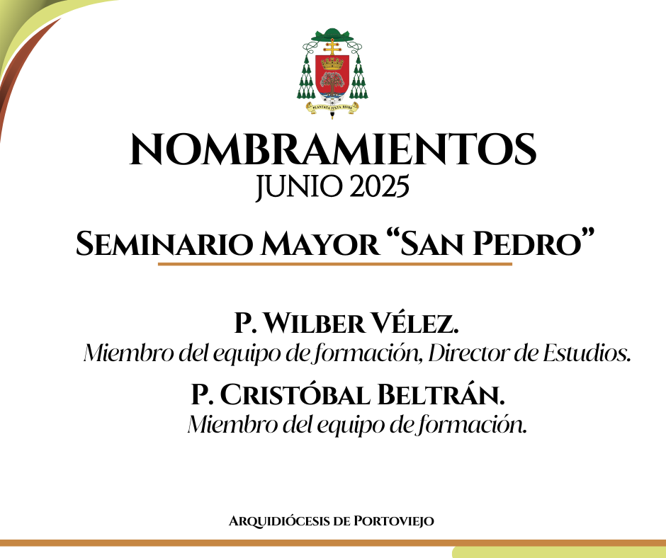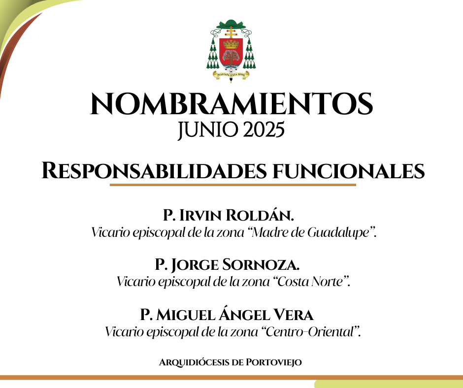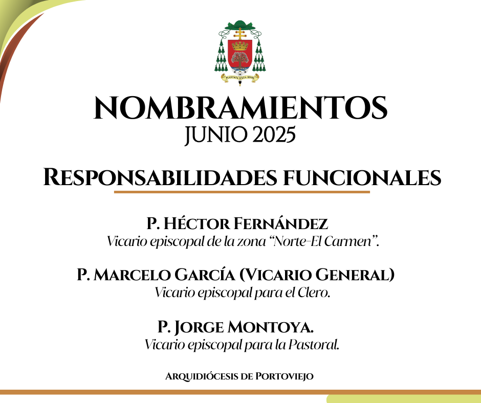 Con alegría, la Arquidiócesis de Portoviejo comunica los nuevos encargos pastorales de nuestros sacerdotes. Les deseamos mucho éxito y bendiciones en sus nuevas misiones. ¡Que Dios los acompañe en cada paso de su importante labor! #ArquidiócesisDePortoviejo #NombramientosSacerdotales
